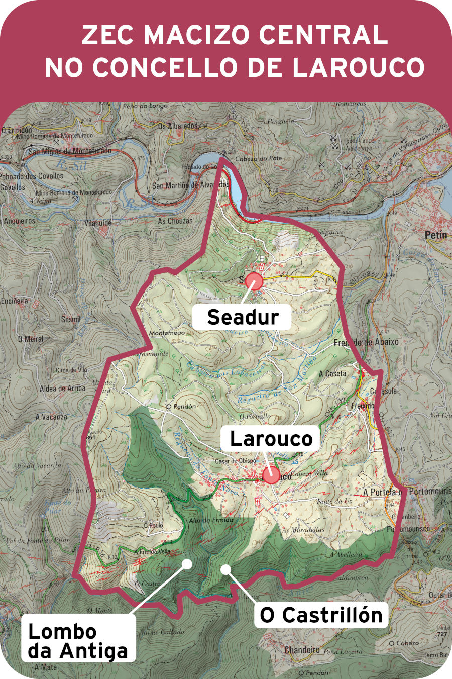 O Río Bibei delimita o Macizo Central polo nordés ata a súa desembocadura no Sil. Neste traxecto atravesa a comarca de Valdeorras, unha zona de marcado carácter mediterráneo con invernos fríos, veráns moi cálidos e secos, e outonos e primaveras suaves. Neste enclave atopamos o sur do concello de Larouco. A razón pola que Larouco pertence ao ZEC Macizo Central está por tanto na presenza de especies mediterráneas capaces de desenvolverse nesas condicións climáticas. Aciñeiras, oliveiras, sobreiras, cantroxos e xaras dan sustento e acubillo a unha fauna que non ten presenza noutras partes de Galicia, como a lagarta colirrubia, a araña touro ou o abellaruco. Todas estas especies conviven con outras máis comúns, e orixinan unha biodiversidade merecedora do recoñecemento e protección da Rede Natura 2000.